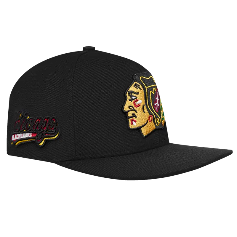 NHL CHICAGO BLACKHAWKS SCRIPT TAIL WOOL SNAPBACK HAT (BLACK)