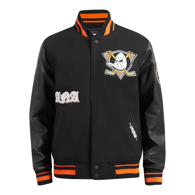 The Pro Standard Premium NHL Anaheim Ducks Old English Men’s Rib Wool Varsity Jacket (Black/Orange)