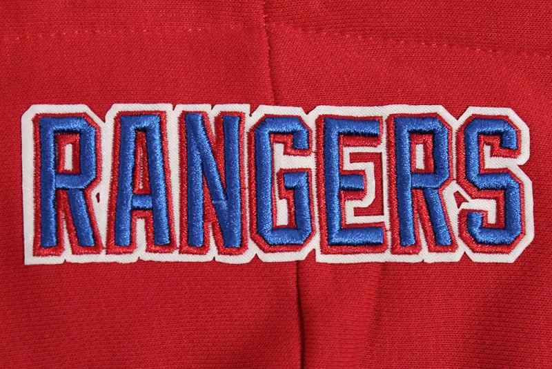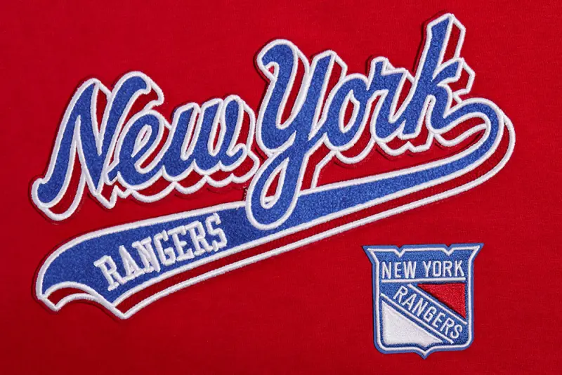 NHL NEW YORK RANGERS SCRIPT TAIL WOMEN’S RIB FLEECE CROPPED PULLOVER HOODIE (RED)