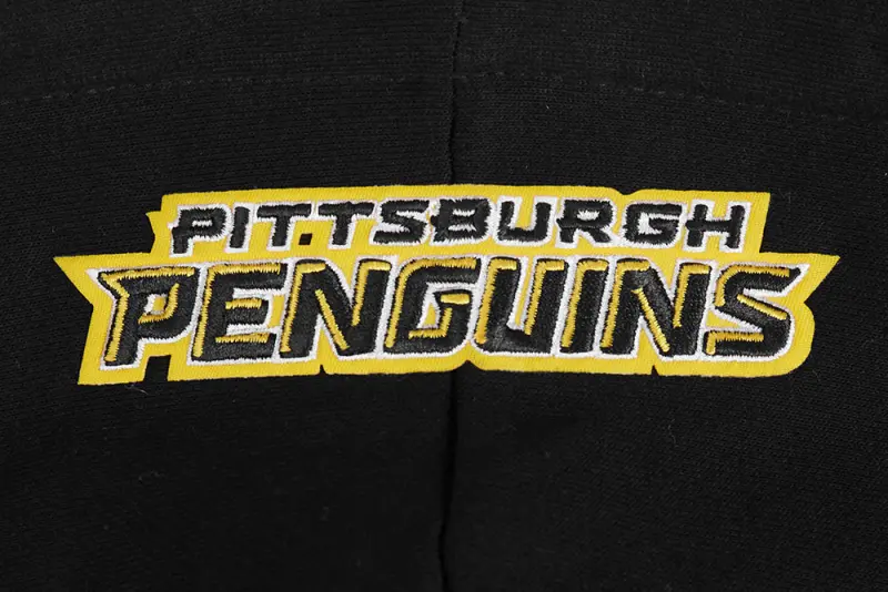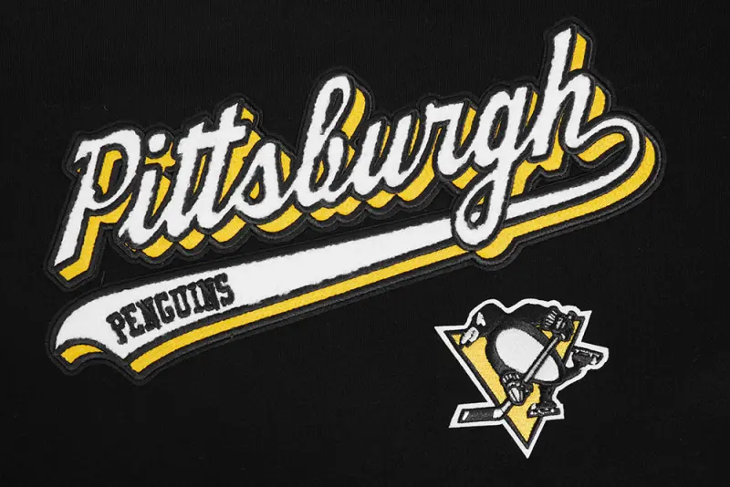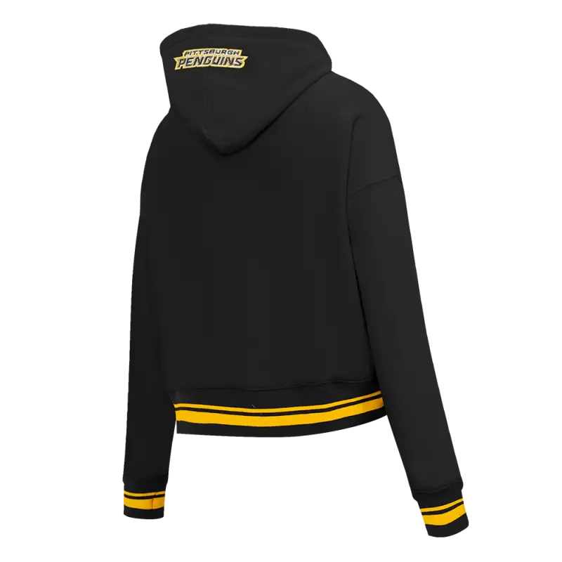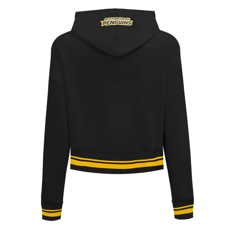 NHL PITTSBURGH PENGUINS SCRIPT TAIL WOMEN’S RIB FLEECE CROPPED PULLOVER HOODIE (BLACK\/YELLOW)